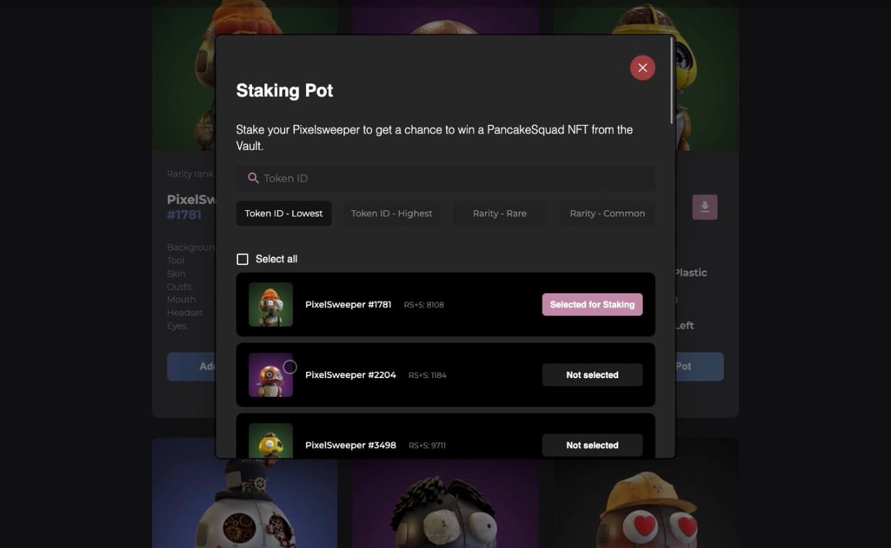 The main reason, right now, to stake your Sweepers is to participate in our Staker Pot drawings for a chance to win a Pancake Squad NFT. The Pancake Squad NFT prize will be randomly selected from the collection we have already swept off the market. You can see all the Pancake Squad NFTs currently in our vault, here (opens new window).